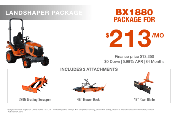 © Kubota Tractor Corporation, 2025. $0 Down, 5.99% A.P.R. financing for 84 months on purchases of new Kubota BX series equipment from participating dealers’ in-stock inventory is available to qualified purchasers through Kubota Credit Corporation, U.S.A.; subject to credit approval. Example: 84 monthly payments of $14.60 per $1,000 financed. Offers expire 12/31/25. Terms subject to change. For complete warranty, disclaimer, safety, incentive offer and product information, consult your Dealer or KubotaUSA.com. 1. Listed series installment credit program not available for Rental, National Accounts or Governmental Customers. For eligibility, customer must pay a percentage of sales price, fees, and taxes per the table below. Subject to amount financed. See Length of Repayment by Amount Financed chart above. Only Kubota and Kubota performance-matched Allied equipment are eligible. Inclusion of ineligible equipment may result in a higher blended A.P.R. Stand Alone Kubota or Allied implements and attachments/accessories are subject to stand alone programs below. Financing is available through Kubota Credit Corporation, U.S.A.; subject to credit approval. Offer expires 12/31/25.